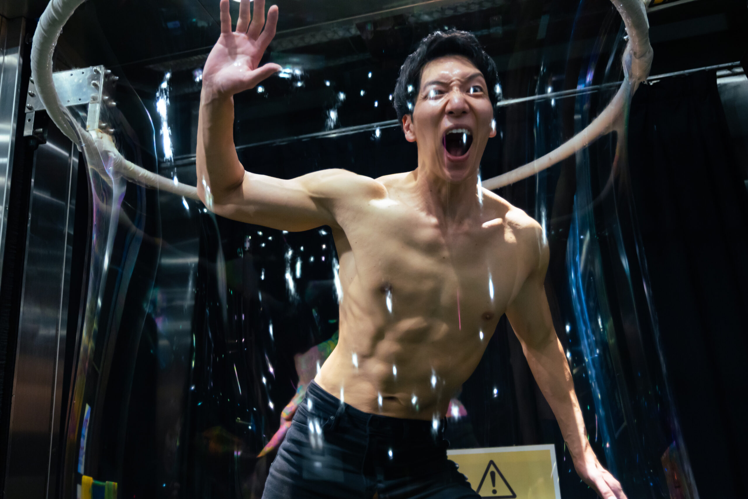 特大シャボン玉で捕獲されたマッチョ@科学技術館