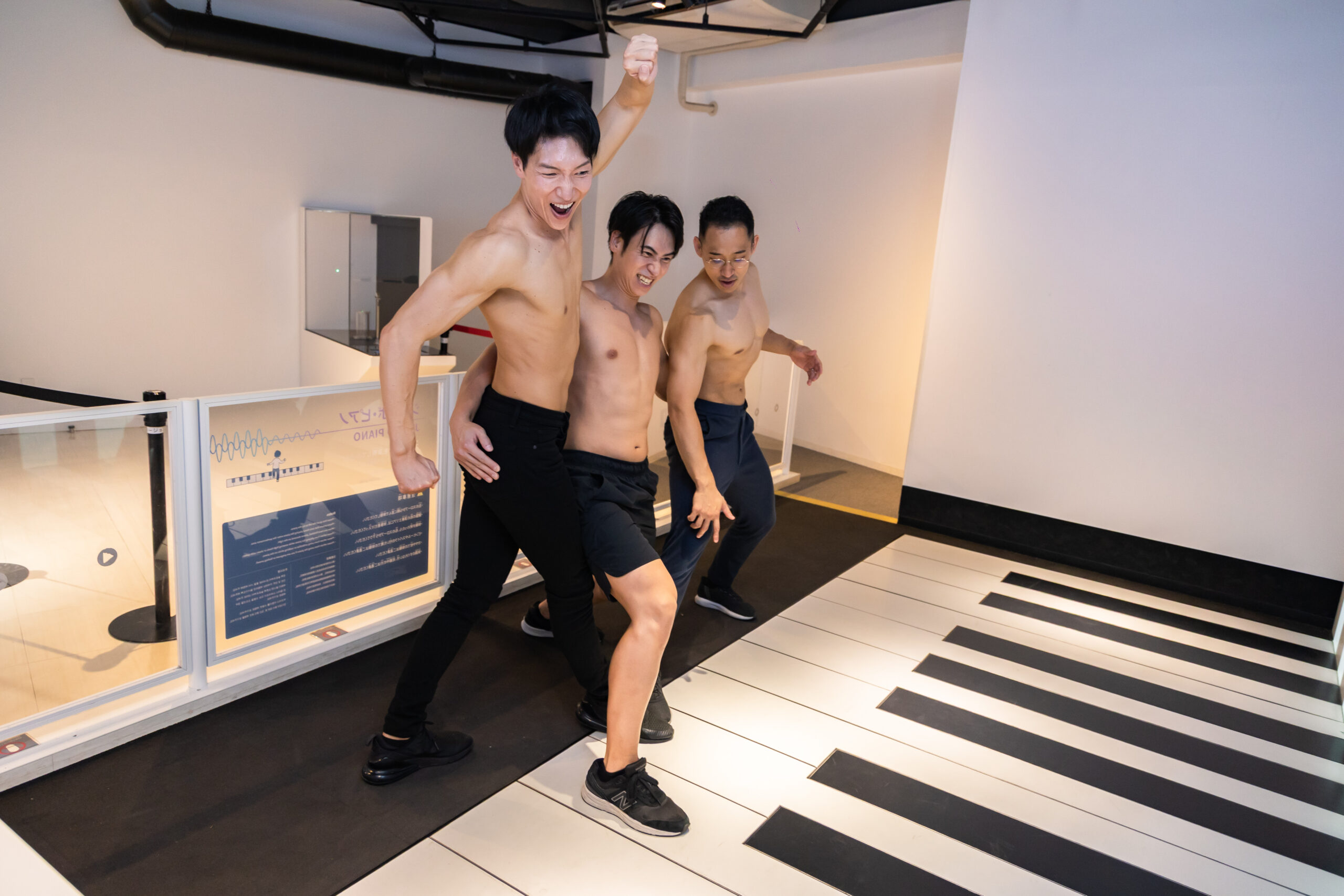 ジャンボピアノで上手く連弾できないマッチョ@科学技術館