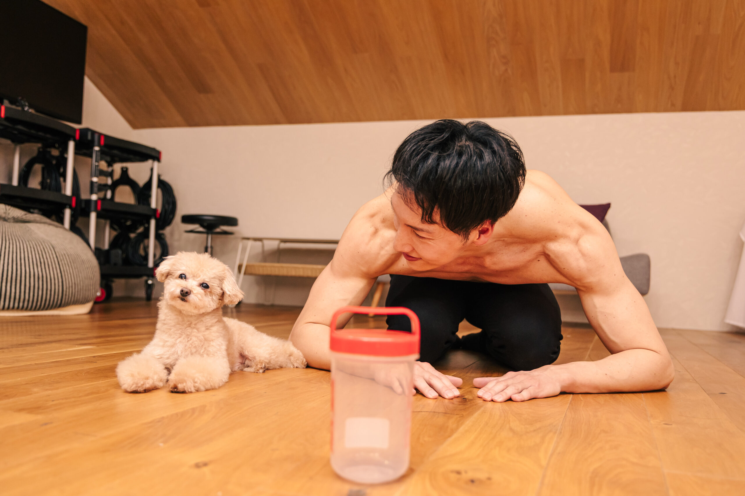 動物とマッチョのフリー素材はこれまでエミュー、水牛、ゾウ、猫たちと撮影してきました!そして、今回は犬!ワンちゃんとマッチョのフリー素材です。YouTubeでも活躍するトイプードルの小殿くんとコラボしました!