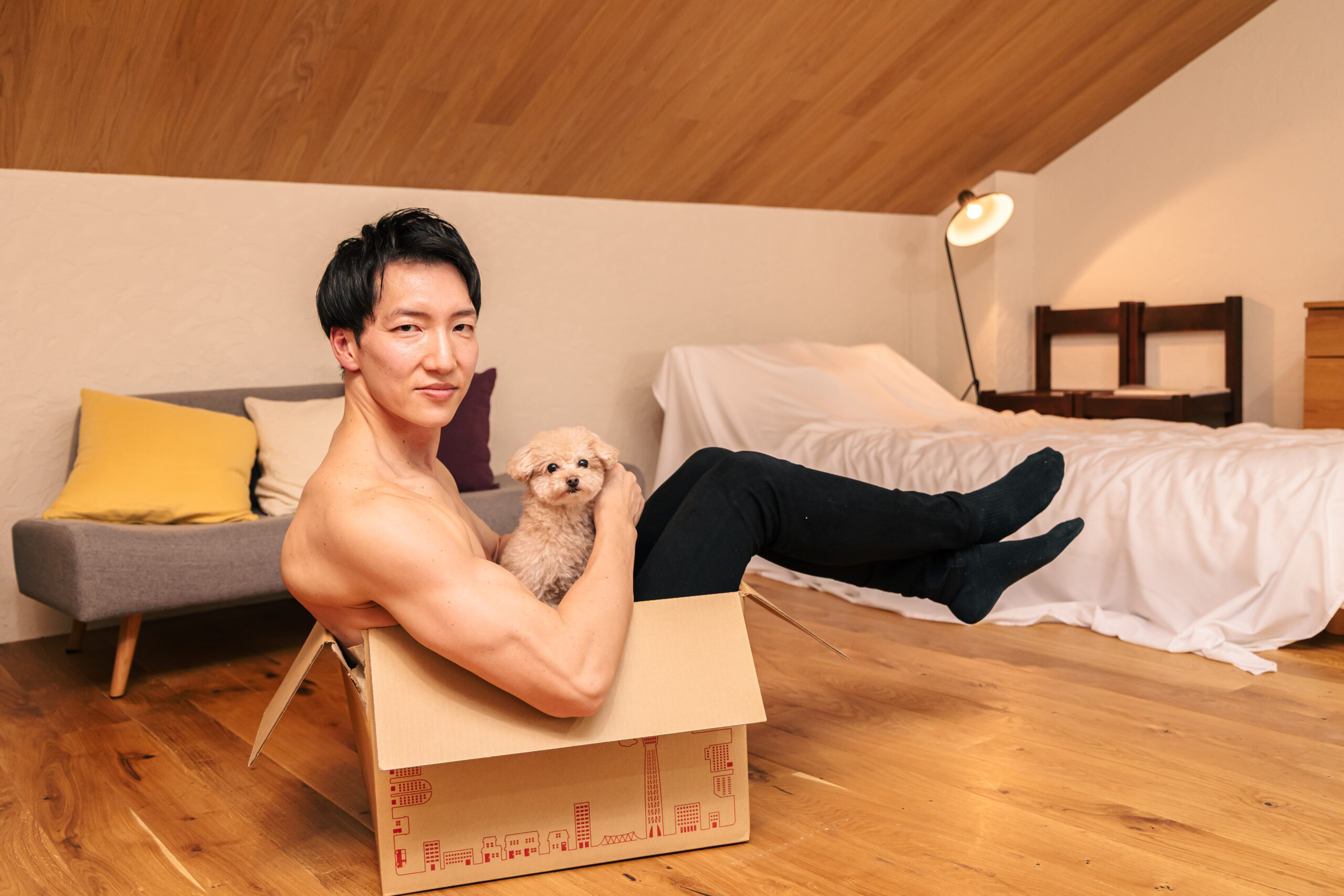 動物とマッチョのフリー素材はこれまでエミュー、水牛、ゾウ、猫たちと撮影してきました!そして、今回は犬!ワンちゃんとマッチョのフリー素材です。YouTubeでも活躍するトイプードルの小殿くんとコラボしました!